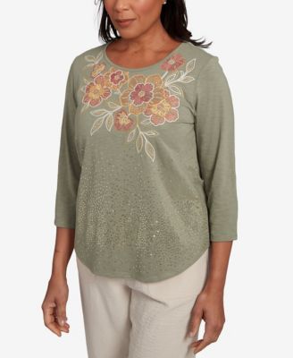 Petite Parrot Cay Scroll Embroidered Cuff Sleeve Top