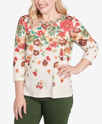 Petite Key Items Abstract Leaf Print Three Quarter Sleeve Top