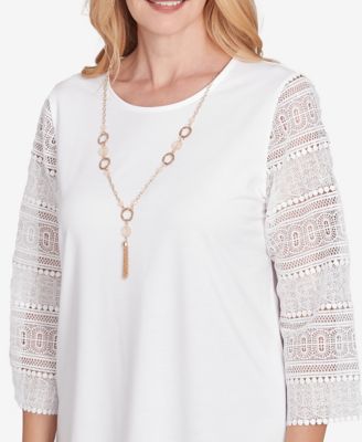 Women's Kensington Gardens Solid Lace Sleeve Knit Top with Necklace