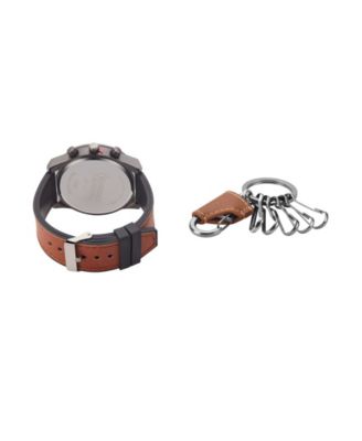 Men's Quartz Movement Cognac Leather Strap Analog Watch, 48mm and Keychain with Zippered Travel Pouch
