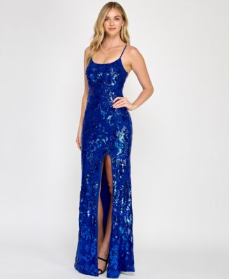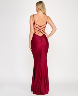 Juniors' Sequined Lace-Up-Back Gown