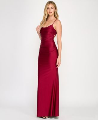 Juniors' Ruched Strappy-Back Satin Gown