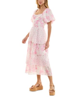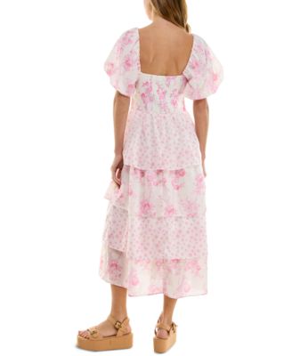 Juniors' Floral-Print Bubble-Sleeve Smocked-Back Tiered Dress