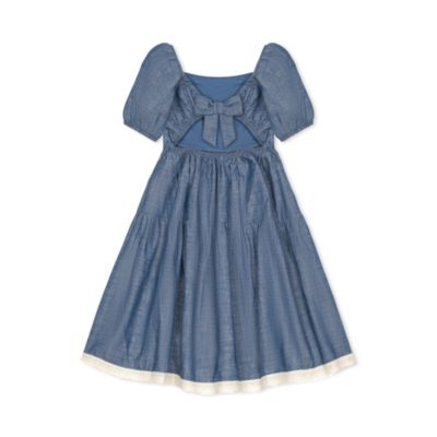 Girls' Short Bubble Sleeve Crochet Trim Chambray Dress, Infant