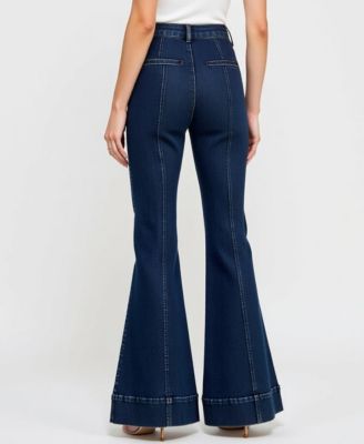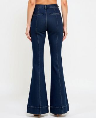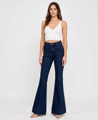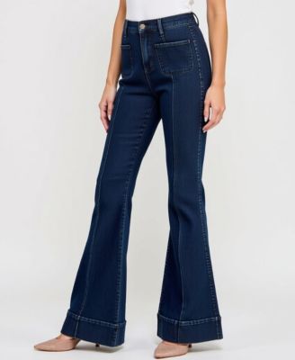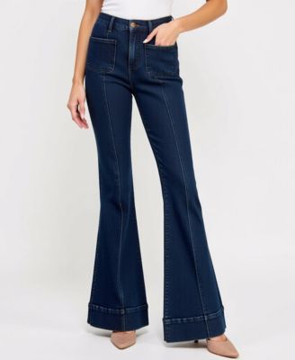 Women's High Waist Flare Cuffed Hem Patch Pocket Jeans