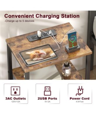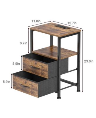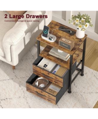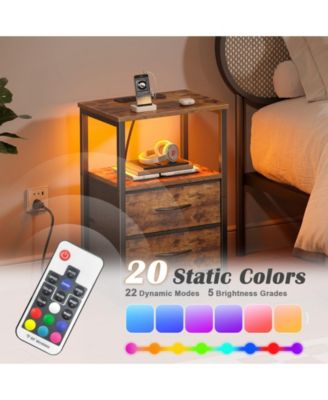Nightstand with Charging Station & Adjustable LED Lights - Set of 2, Rustic Brown End Table with Fabric Drawers, Bedside Table with Storage Shelf