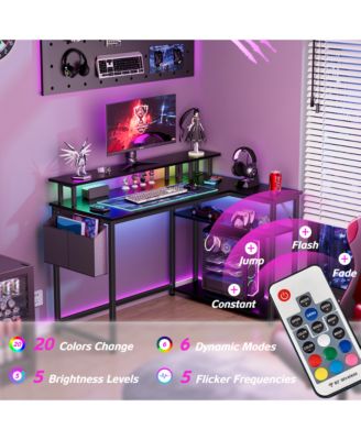 L-Shaped Office Desk with Power Outlets & LED Lights, 47" Computer Desk with Monitor Stand, Black