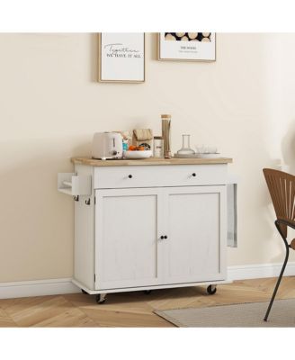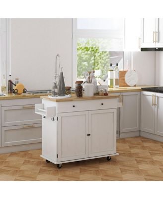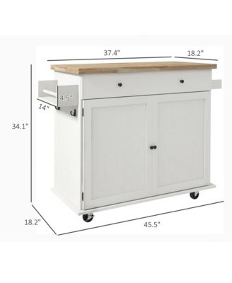 Kitchen Island with Storage, Farmhouse Rolling Kitchen Island Cart on Wheels with Drawer, 2 Cabinets, Rubberwood Top, Spice Rack, Towel Racks and 2 Hooks, Distressed White