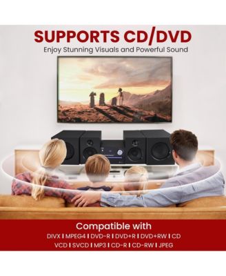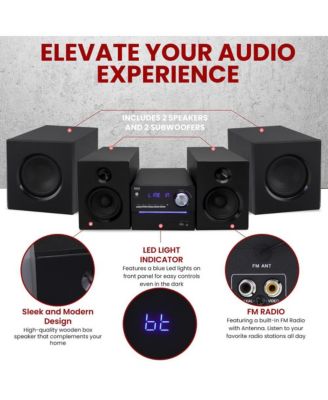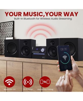 Stereo Shelf Systems Tray Loading CD Player with Digital FM Radio, Bluetooth Streaming, Remote Control in Black | LCD Display | 3.5mm Headphone Jack | MP3 & AUX Port Compatible