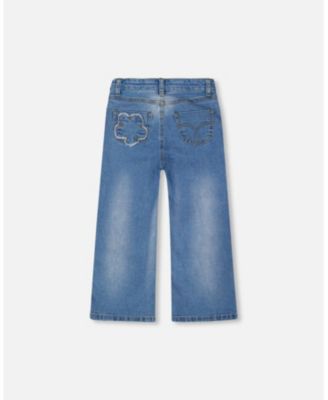 Girl Wide Leg Stretch Light Blue Denim Jeans with Flower Stitching - Child