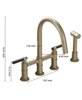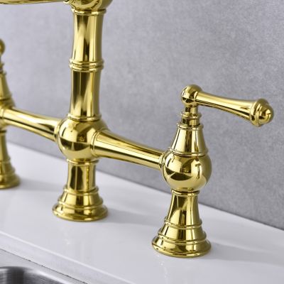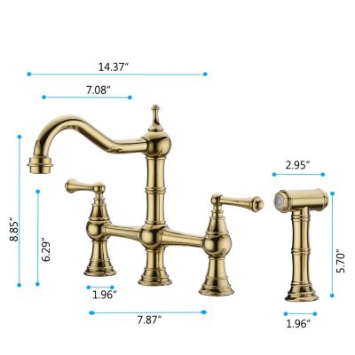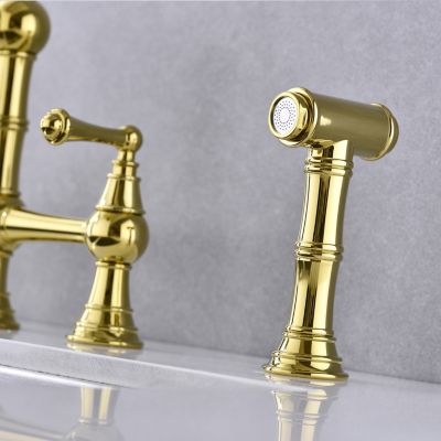 Double Handle 4-Holes Deck Mount Bridge Kitchen Faucet with Side Sprayer Sink Faucet 360 Swivel Spout in Brushed Gold